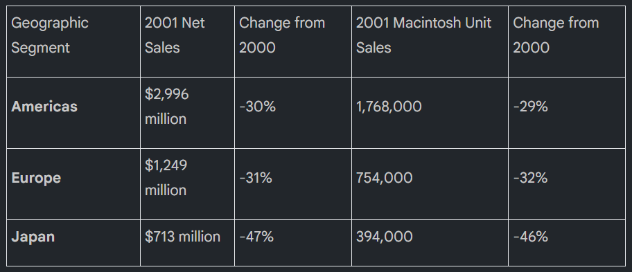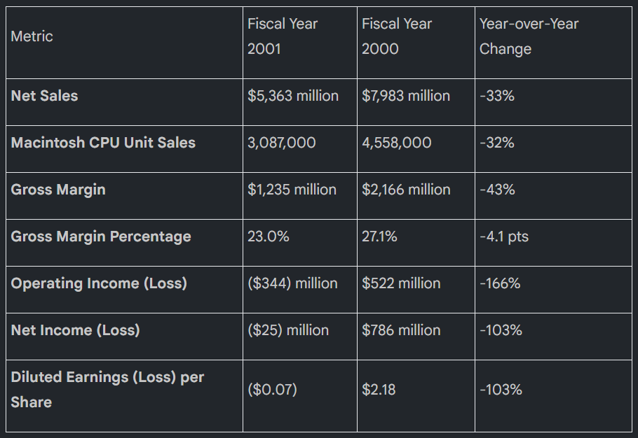Fiscal year 2001 saw a significant contraction in Apple’s financial results compared to the prior year. The performance reflects a difficult global economic climate, strategic inventory adjustments, and the market’s reaction to major product transitions.